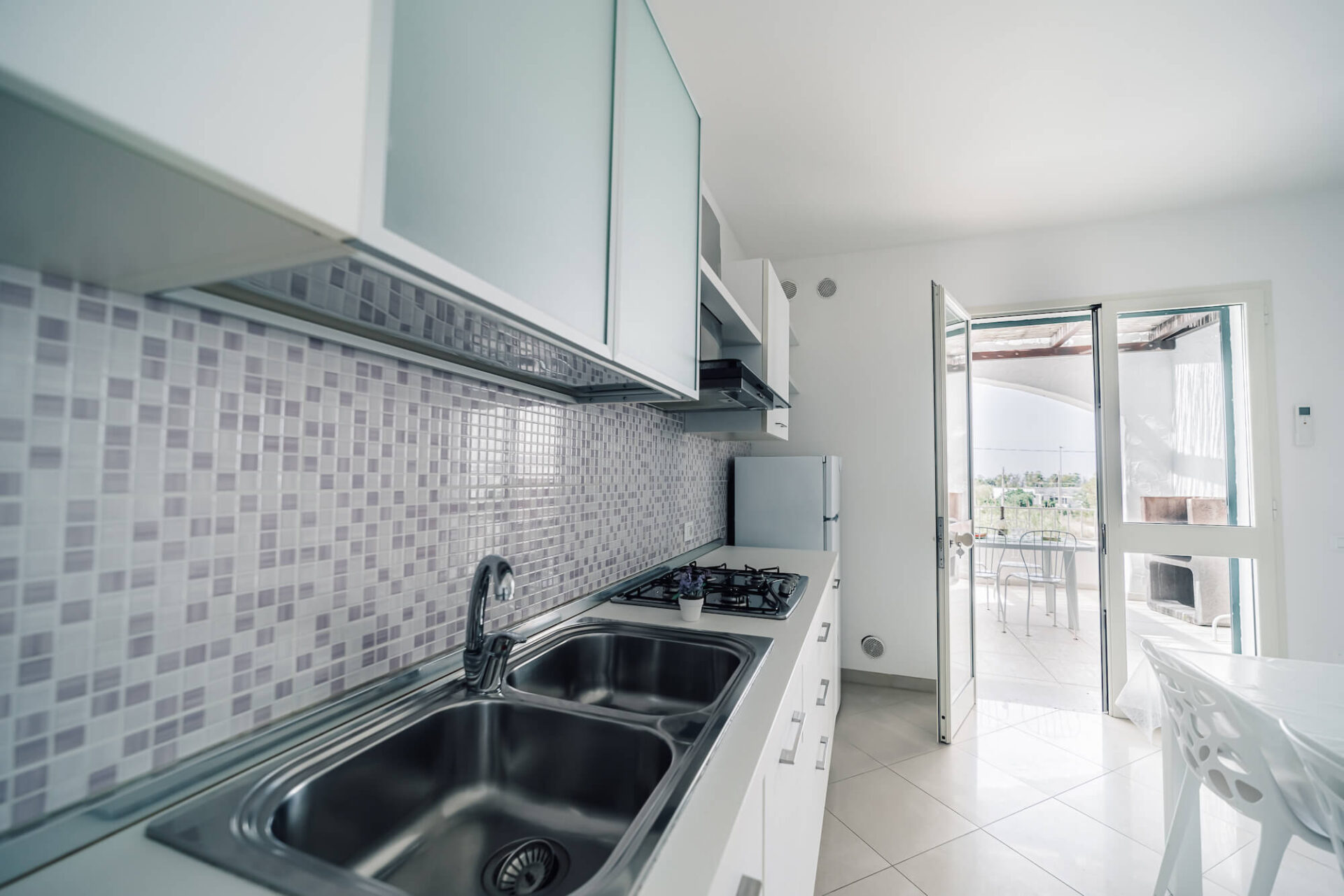 L’ appartamento ha accesso ad una zona esterna coperta da ampie e luminose vetrate e ad una terrazza scoperta con doccia esterna e area lavanderia.