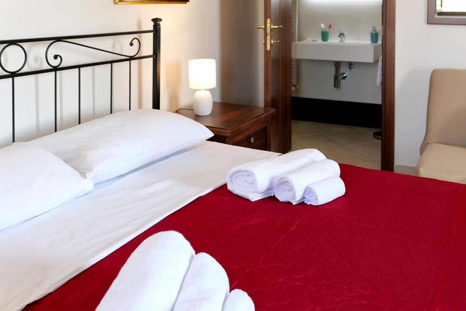 La camera (20 mq), può accogliere fino a tre ospiti ed è dotata di: letto matrimoniale con divano letto aggiuntivo, minifrigo, TV e un piccolo tavolo d’appoggio.