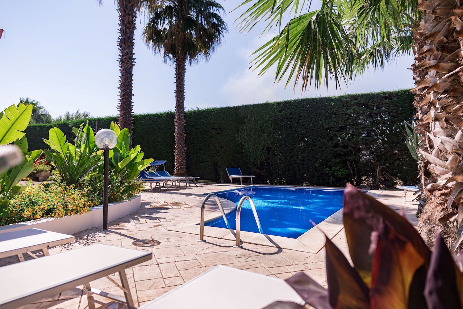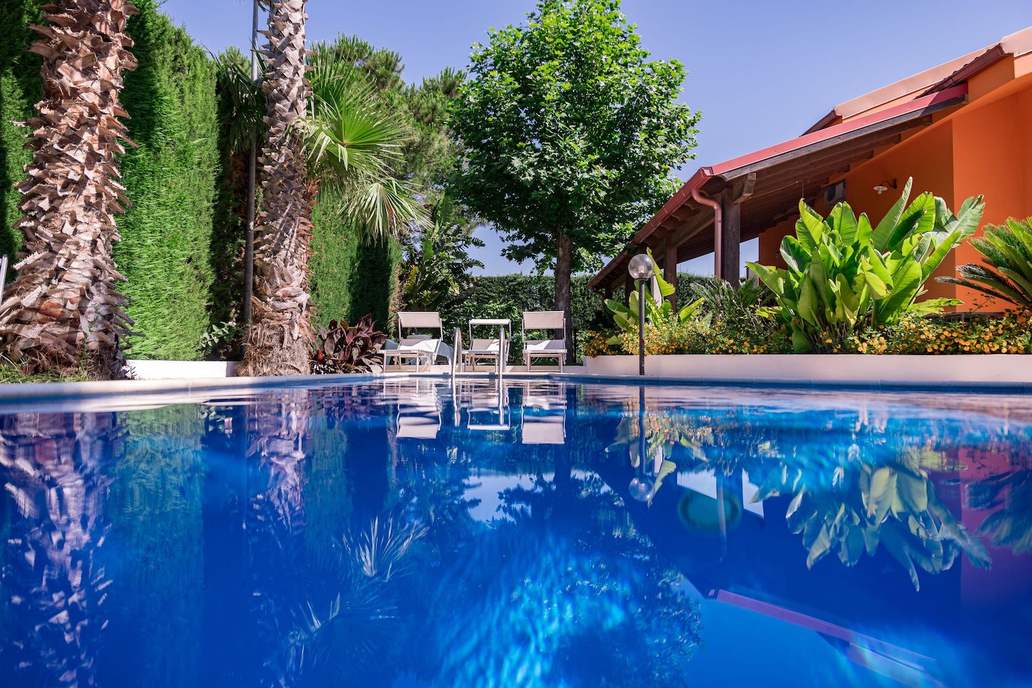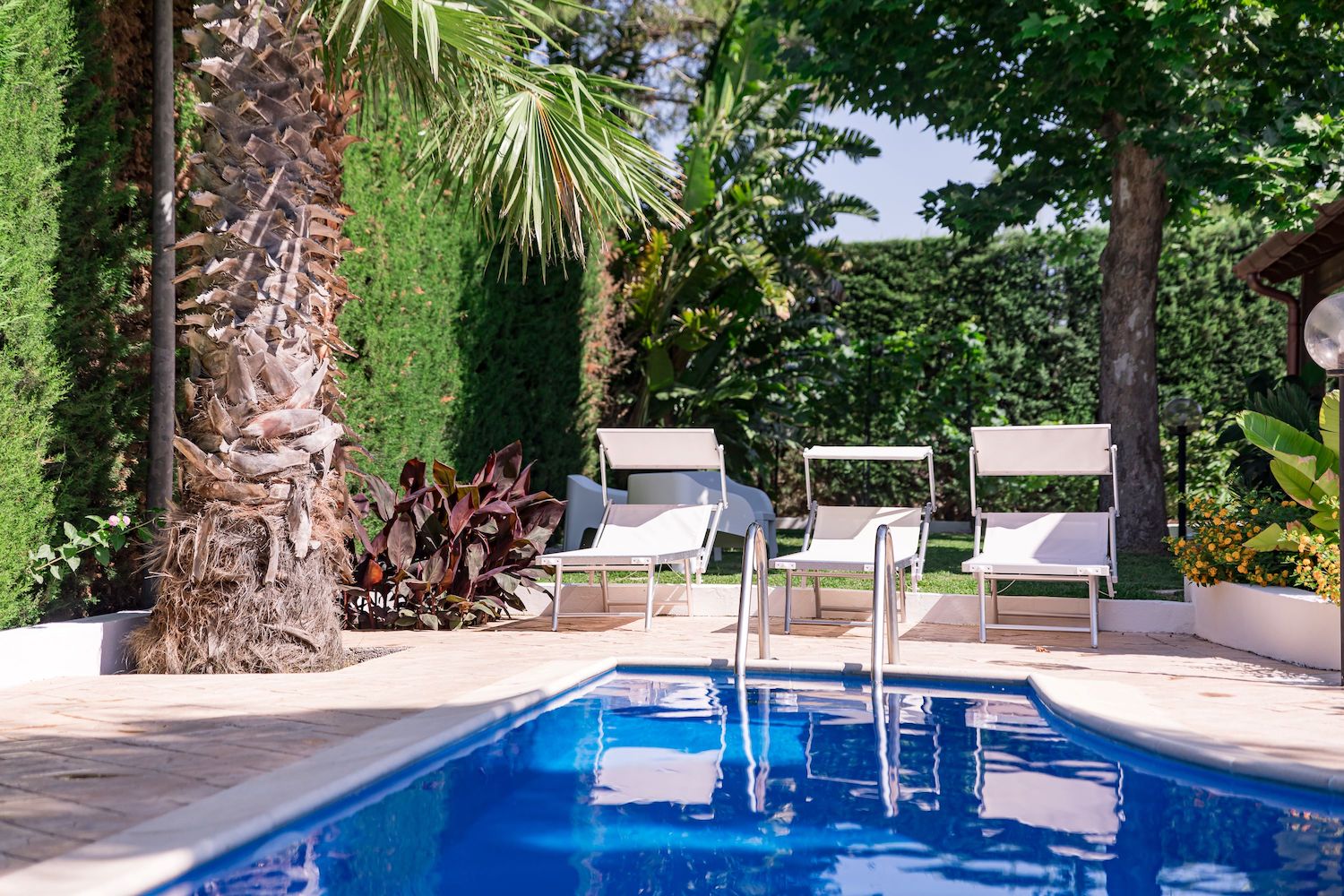 Bellissima villa contornata da un grande e curatissimo giardino con diverse tipologie di piante colorate, prato inglese ed una splendida piscina in muratura con attrezzatura da solarium.