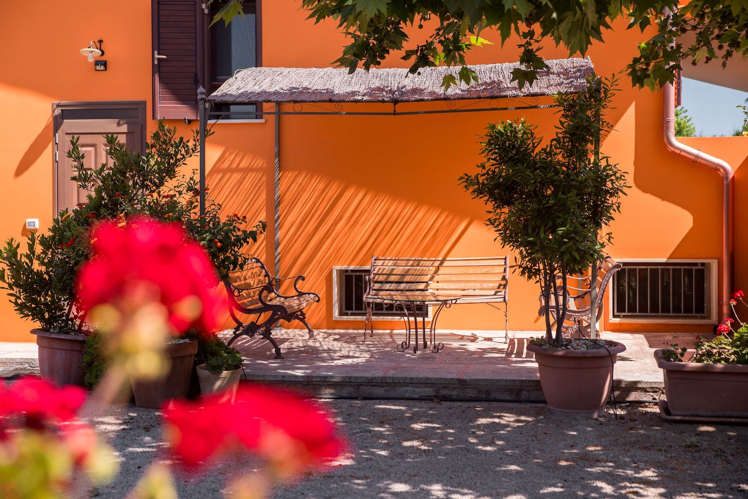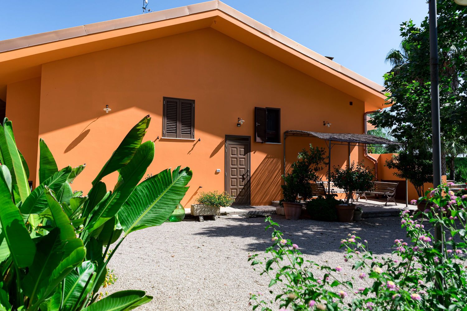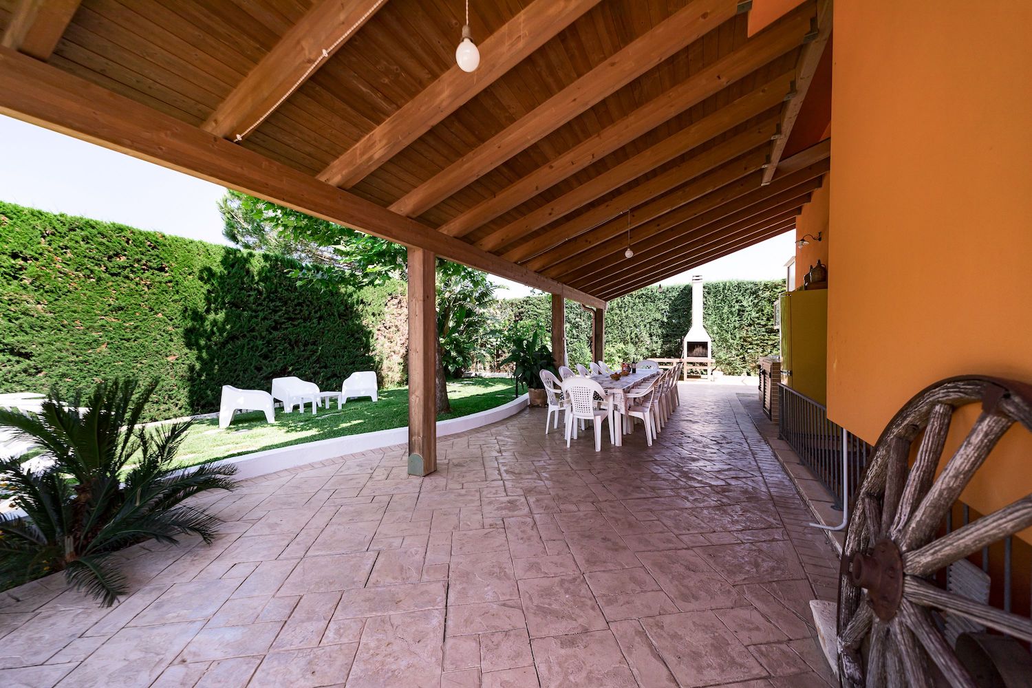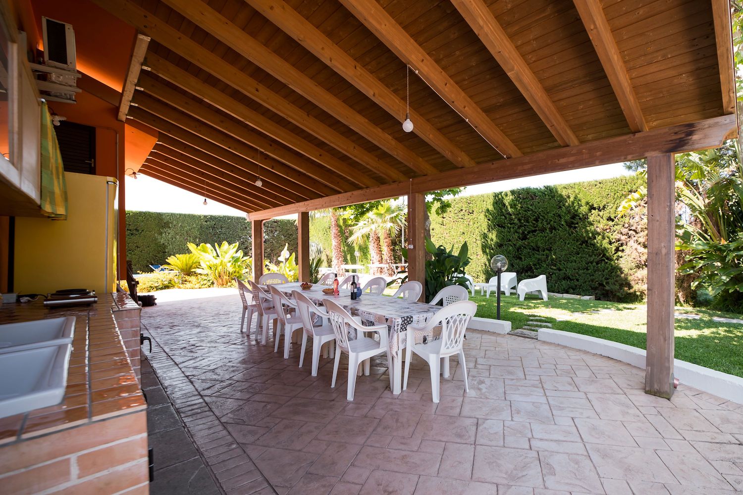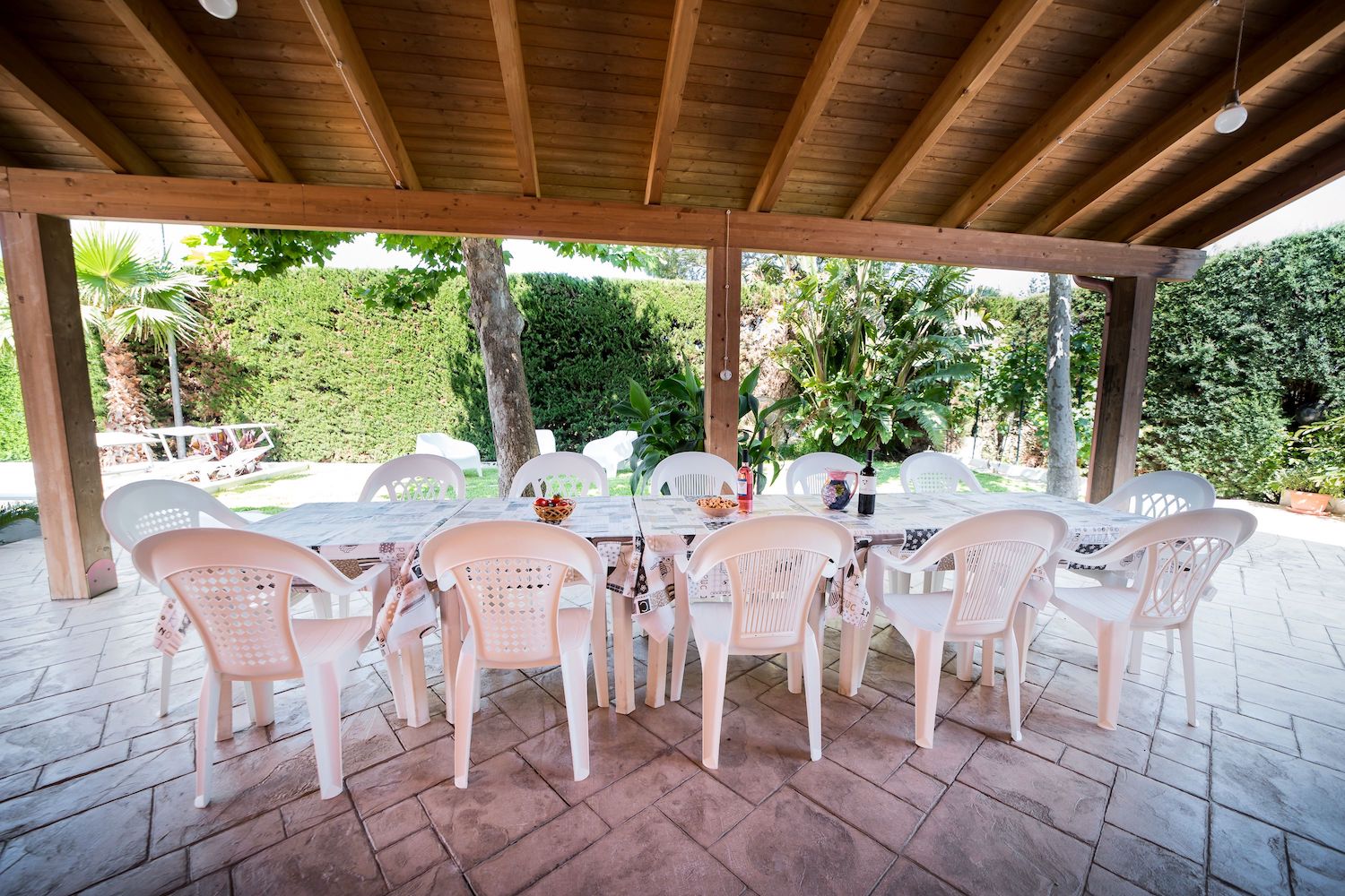 La zona esterna è dotata inoltre di un grande pergolato ombreggiato arredato di piano cottura, barbecue, tavoli e sedie adatti per trascorrere momenti di condivisione con il proprio gruppo all' aperto.